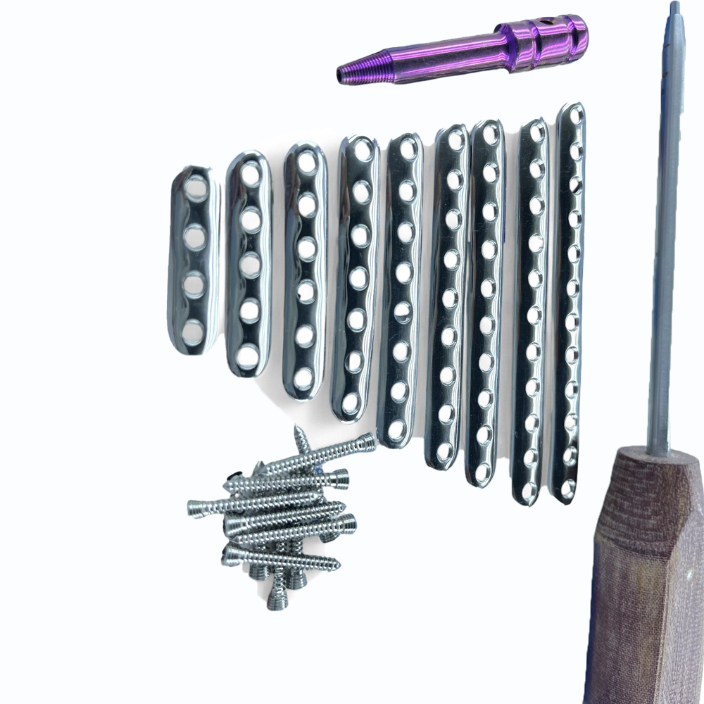 These 2.7 mm Locking Quarter Tubular Plates – 4 to 12 Holes with LCP Screws – 130 pcs SS 316L are designed for angular-stable fixation of small bones such as the radius, ulna, and phalanges. Manufactured from SS 316L stainless steel, the plates are corrosion-resistant, strong, and lightweight. They accommodate 2.7 mm LCP screws and are available in 4–12 hole configurations to treat a wide range of fracture types. The 130-piece set provides surgeons with a complete solution for small-bone trauma and metaphyseal fracture stabilization.