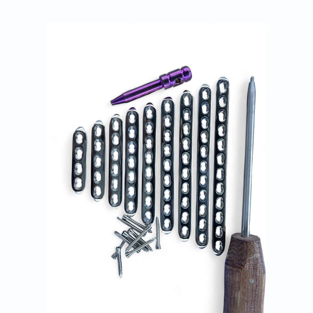 This 2.7 mm Locking Straight Plates (4–12 Holes) with 2.7 mm LCP Screws – 66 Pc Set (SS 316L) is designed for small-fragment orthopedic fixation in the hand, forearm, ankle, and other anatomical areas requiring compact yet strong implants. Crafted from Stainless Steel 316L, the plates deliver excellent strength, durability, and resistance to corrosion. The locking compression design allows screws to lock securely into the plate, forming a stable fixed-angle construct that enhances fracture stability and reduces micromovement. Available in lengths ranging from 4 to 12 holes, the system offers flexibility for a wide variety of fracture patterns and surgical needs. The included 2.7 mm LCP screws ensure perfect compatibility and stable fixation.