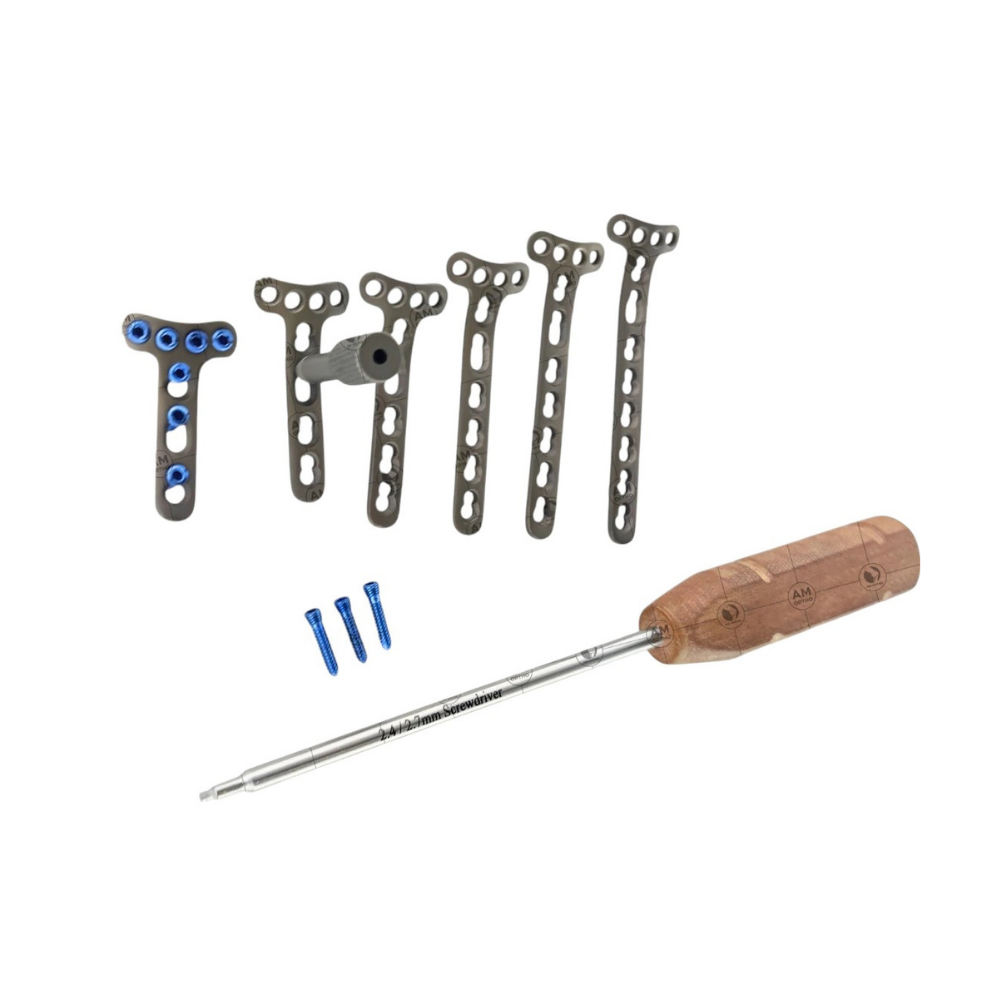 This 2.7mm Safety Locking 4-Hole Head T Plates – 3 to 8 Holes with Screws, 88 Pieces is engineered for small bone fracture fixation, including hand, wrist, and distal radius fractures. Made from Titanium Grade 5, the plates combine strength, corrosion resistance, and biocompatibility. The system includes T-shaped plates ranging from 3 to 8 holes, with a total of 88 pieces including locking screws. The pre-contoured design reduces intraoperative bending and ensures an anatomical fit, providing stable fixation while minimizing soft tissue trauma.