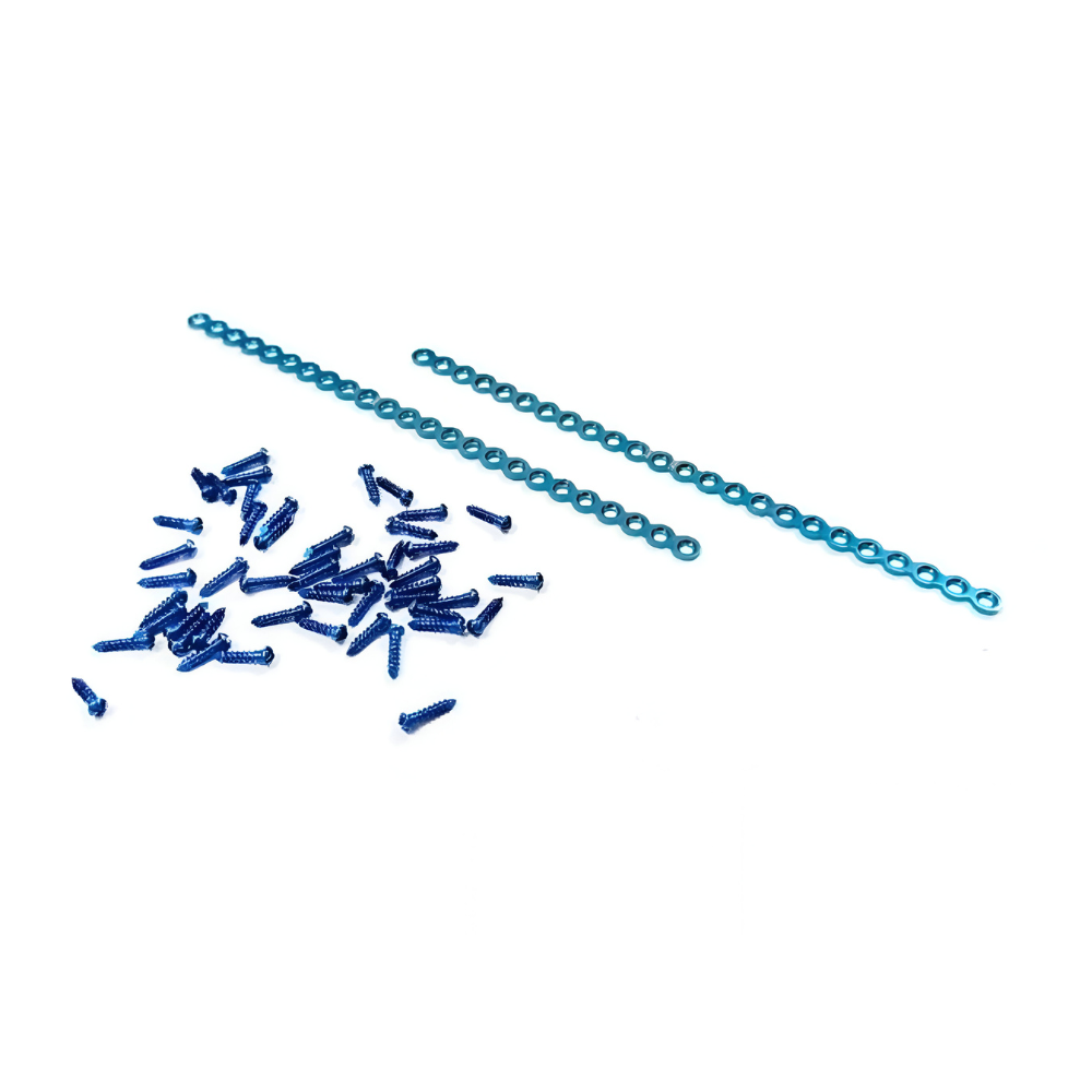 This 2 Titanium Mini Plates with 24 Holes + 50 Maxillofacial Screws – 1.5 mm System is designed for craniofacial stabilization and reconstruction. The set includes two titanium plates with 24 holes and 50 high-strength screws, providing excellent versatility for fracture fixation in the midface, mandible, and orbital regions. Crafted from biocompatible titanium, the implants offer outstanding mechanical stability, contourability, and radiographic friendliness. Designed for consistent engagement with driver tools, the screws provide secure hold and smooth insertion. This complete mini-plate system supports reliable fixation in trauma and reconstructive CMF surgery.