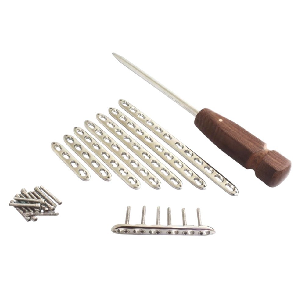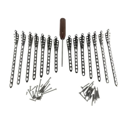 • Comprehensive 109-piece LCP system including plates, screws, and screwdriver.