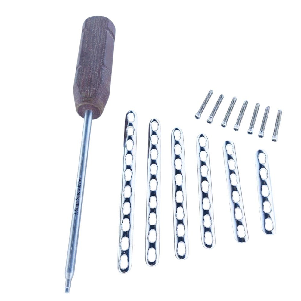 The 3.5mm One Third Tubular Locking Plates with Screws and Screwdriver, 112 Pcs Stainless Steel Set is designed for small bone fixation in orthopedic and veterinary procedures. The set includes tubular plates, screws, and a precision screwdriver, all crafted from surgical stainless steel for durability, corrosion resistance, and repeated sterilization. The one-third tubular design ensures low-profile fixation while maintaining strong mechanical stability.
