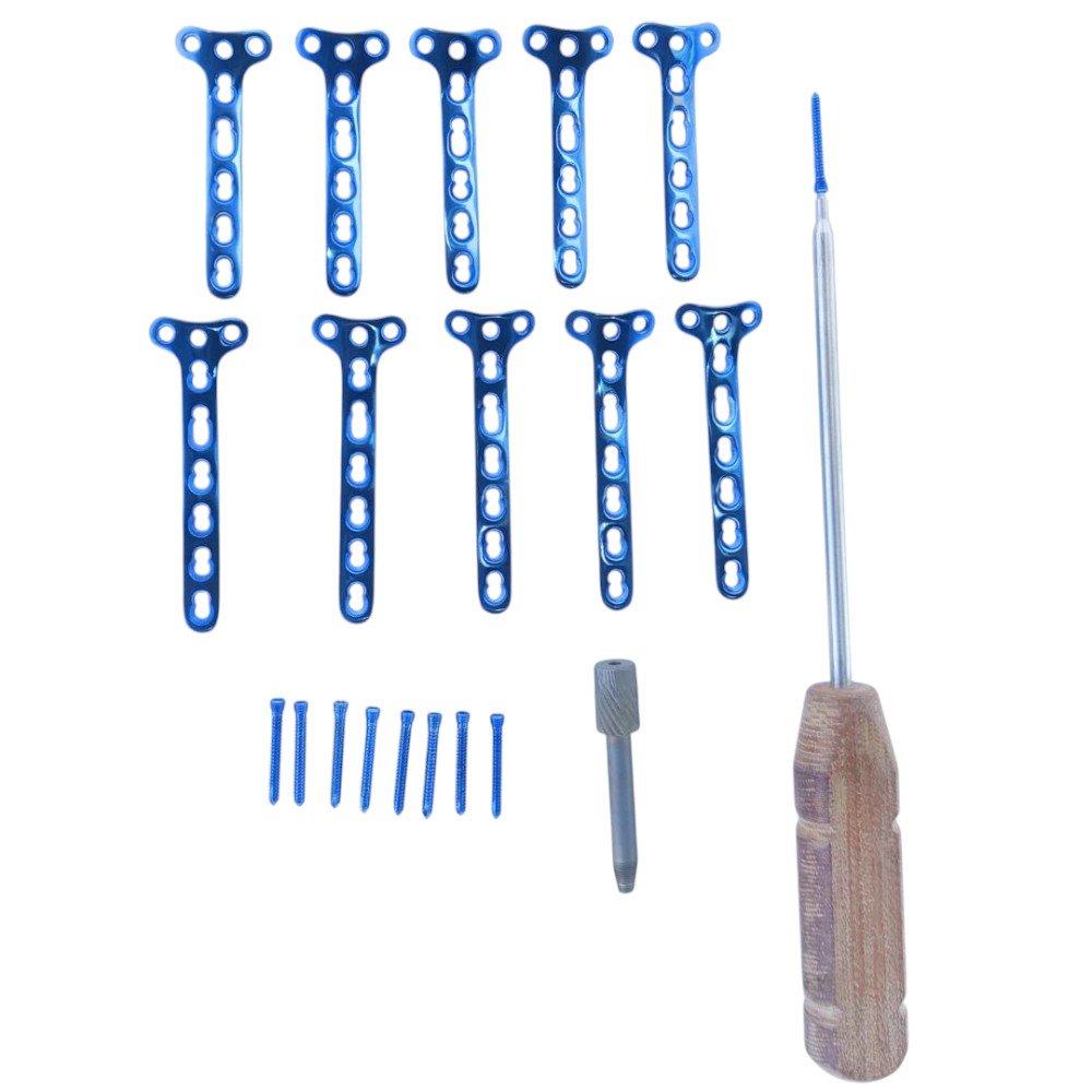 The 3.5mm Safety Locking 3-Hole Head T Plates – 4 to 8 Holes with Screws, 92 Pcs Titanium Set is designed for rigid fixation of small-bone fractures in orthopedic and craniofacial surgery. The set includes 3-hole head T plates (4–8 holes) with matching locking screws, featuring a safety-locking mechanism for stable angular fixation. Made from titanium alloy, these plates ensure strength, biocompatibility, and corrosion resistance.