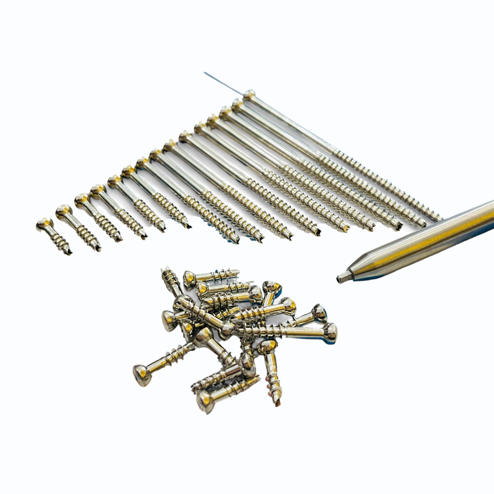 These 4 mm Cannulated Cancellous Screws – Partial Thread (14–90 mm) – Stainless Steel 316L (64 pcs) are engineered for fixation across metaphyseal and cancellous bone regions where controlled compression is required. Constructed from surgical-grade Stainless Steel 316L, they deliver excellent strength, high corrosion resistance, and long-term durability inside the body. The cannulated design enables precise placement using guidewires, reducing surgical trauma and increasing insertion accuracy. The partial-thread section creates efficient lag compression across fracture lines, making these screws ideal for joint, foot, ankle, and upper-limb trauma surgeries. Available in lengths from 14 mm to 90 mm, the system provides comprehensive flexibility for diverse orthopedic applications.