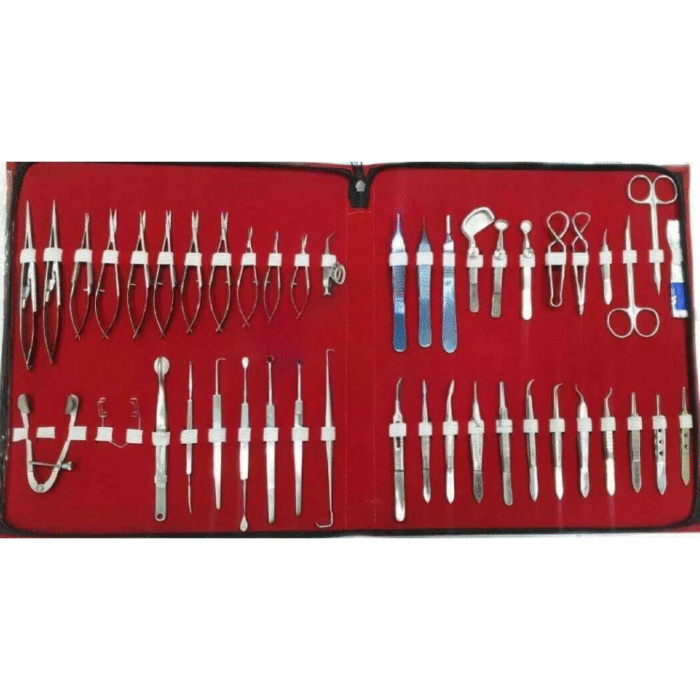Complete 46-piece ophthalmic surgery set designed for microsurgical precision.