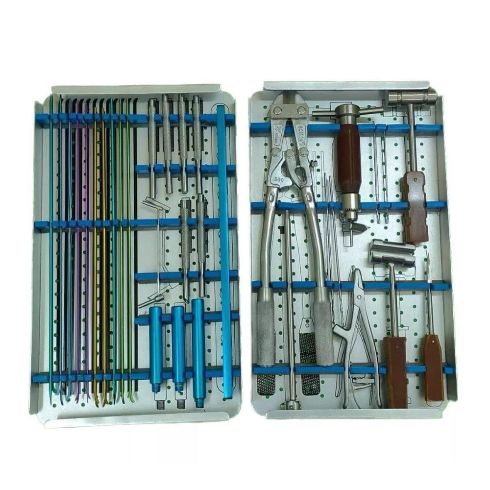 The Elastic Nail Instrument Set – Veterinary Orthopedic Surgery Instrument Kit is a specialized surgical tool collection designed for veterinary orthopedic procedures involving elastic intramedullary nailing. This set enables effective fracture stabilization for long bones in small and medium-sized animals. Manufactured using high-strength surgical stainless steel, each tool offers excellent durability, ergonomic handling, and smooth mechanical function. The set includes nail inserters, extractors, cutters, gauges, and supporting instruments required for accurate nail placement and removal. Its design supports minimally invasive techniques, reducing tissue disruption while improving fracture healing outcomes.