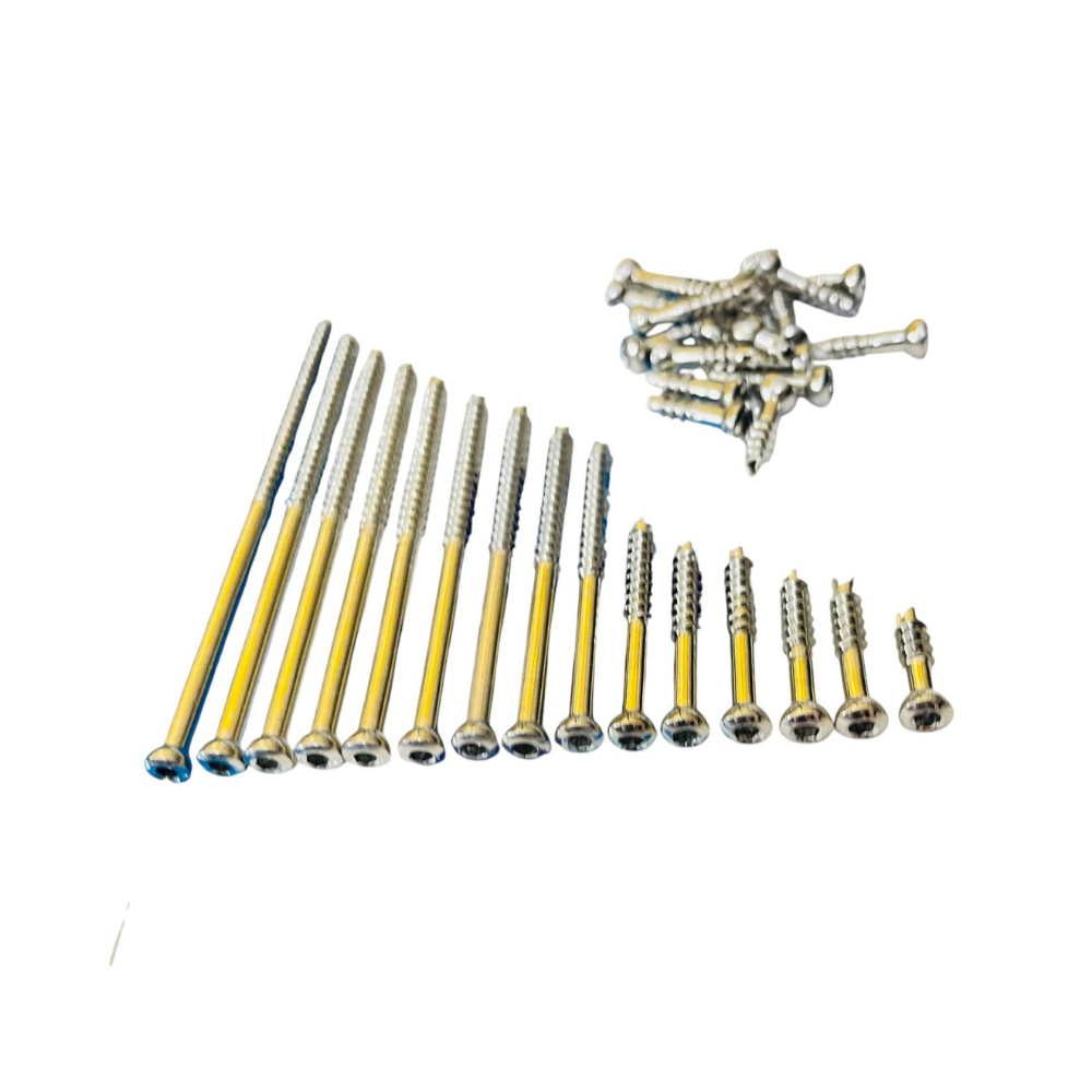 4mm Cannulated Cancellous Screw, Partial Thread, 14-90mm, SS 316L (106 Pieces) are ideal for applications in metaphyseal and epiphyseal regions. The partial threading provides superior compression across fracture sites, while the cannulated design enables precise placement over a guide wire for minimal surgical trauma. Manufactured from surgical-grade SS 316L, these screws offer excellent corrosion resistance and mechanical strength, ensuring durability in diverse orthopedic procedures. The set includes 106 screws, ranging from 14mm to 90mm, offering comprehensive size options for all surgical requirements.