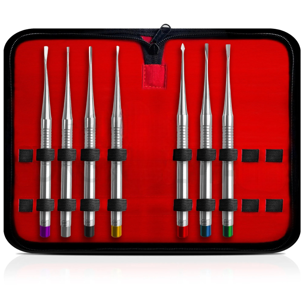 The 7 Pcs Dental Proximators PDL Luxating Root Elevator Set is a precision-engineered collection of instruments designed for atraumatic tooth extractions. These proximators combine the benefits of both luxators and elevators, allowing dental professionals to cut periodontal ligaments (PDL) and expand the socket gently while minimizing damage to surrounding bone and soft tissue.