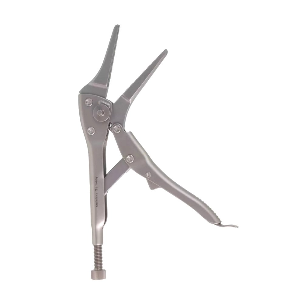 8-1/2″ Medium Needle Nose Locking Plier – Extraction Hammer Mod. The 8-1/2″ Medium Needle Nose Locking Plier – Extraction Hammer Modified is a specialized surgical tool designed for firm gripping and controlled extraction during orthopedic and dental procedures. Its elongated needle-nose jaws allow access to confined spaces, while the locking mechanism secures a stable hold on wires, pins, or fragments. The added extraction hammer modification provides enhanced mechanical leverage for controlled impact removal.