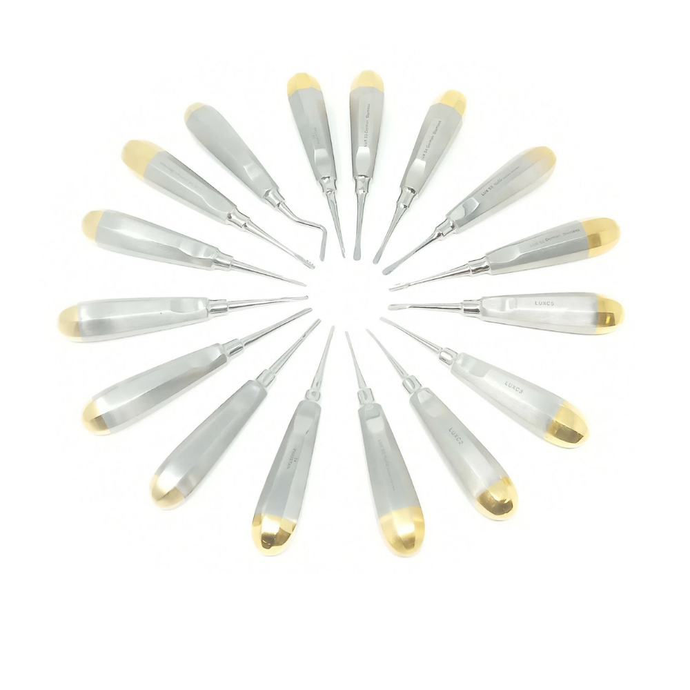 This Assorted Pedo Dental Root Elevators – 27 PCS Orthodontic & Surgical Extraction Set with Gold Handles is engineered to deliver maximum precision, control, and versatility during pediatric extractions and orthodontic surgical procedures. Designed specifically for smaller tooth anatomy, each elevator features a carefully contoured working tip that provides optimal access to tight spaces, minimizing trauma to the surrounding gingiva and periodontal ligament. The gold-handled, medical-grade stainless-steel construction ensures long-lasting durability, resistance to corrosion, and excellent tactile feedback, even during demanding procedures. This set includes a variety of straight, curved, and fine-angled elevators to manage a full spectrum of pediatric extractions, root luxation, and orthodontic surgical tasks. Ideal for pediatric dentists, oral surgeons, and orthodontists seeking a complete, reliable instrumentation set.
