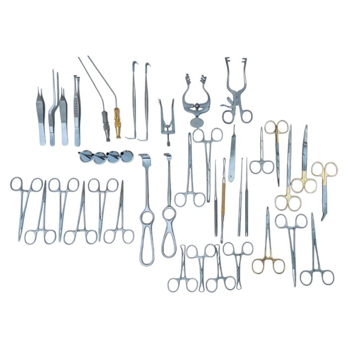 • Includes scalpels, forceps, scissors, retractors, and ear-specific tools