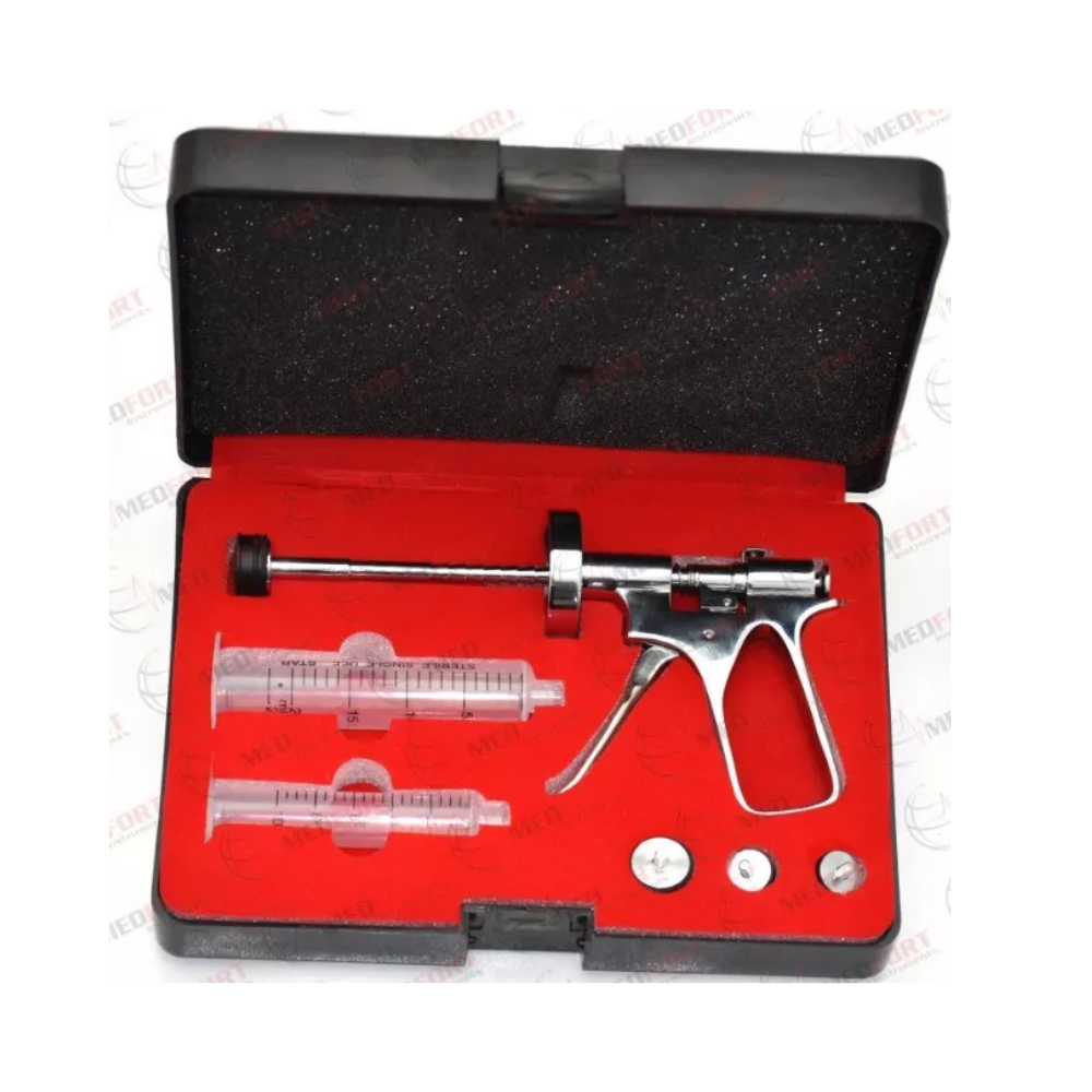 Constructed from durable surgical-grade materials, the gun features a smooth trigger mechanism for consistent flow, an ergonomic handle for minimal surgeon fatigue, and a reliable locking system to prevent accidental syringe disengagement. The included storage box ensures organized, sterile transportation and preparation for operating room use. Ideal for liposuction-to-fat-transfer procedures in facial, breast, and body contouring applications.