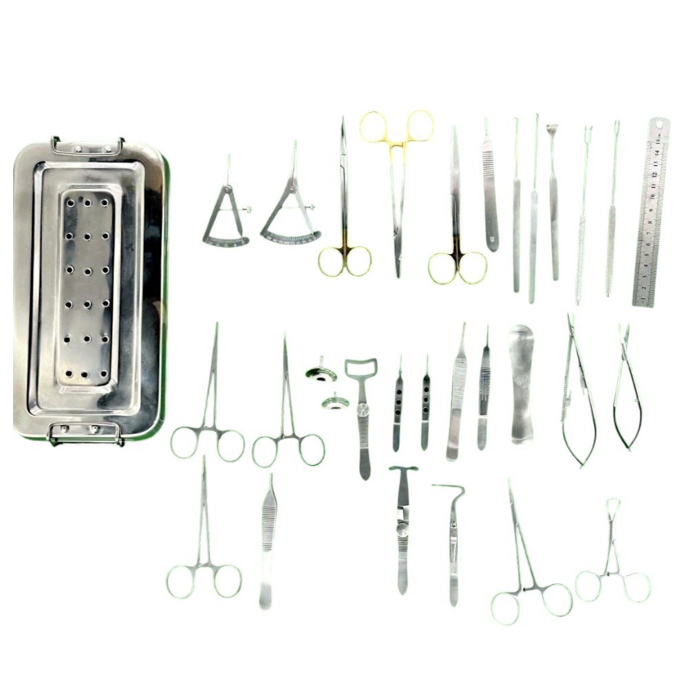 Includes fine scissors, forceps, retractors, scalpels, and elevators