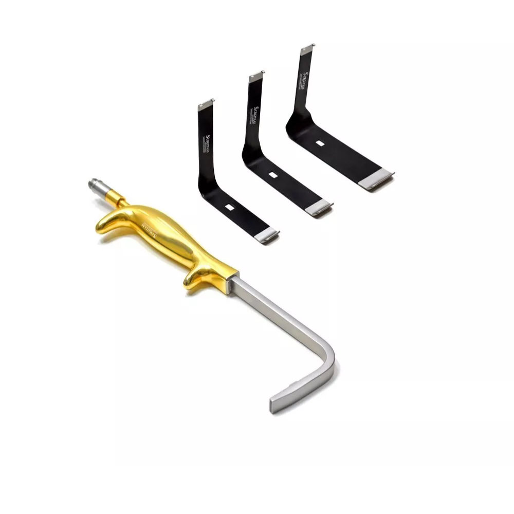 The retractor includes three interchangeable blades, allowing surgeons to adapt the instrument to different anatomical requirements, skin thicknesses, incision depths, and surgical techniques. Each blade is crafted from high-grade surgical stainless steel for stability, strength, and corrosion resistance. The ergonomic handle is optimized for comfort, ensuring firm control even during long, complex procedures.