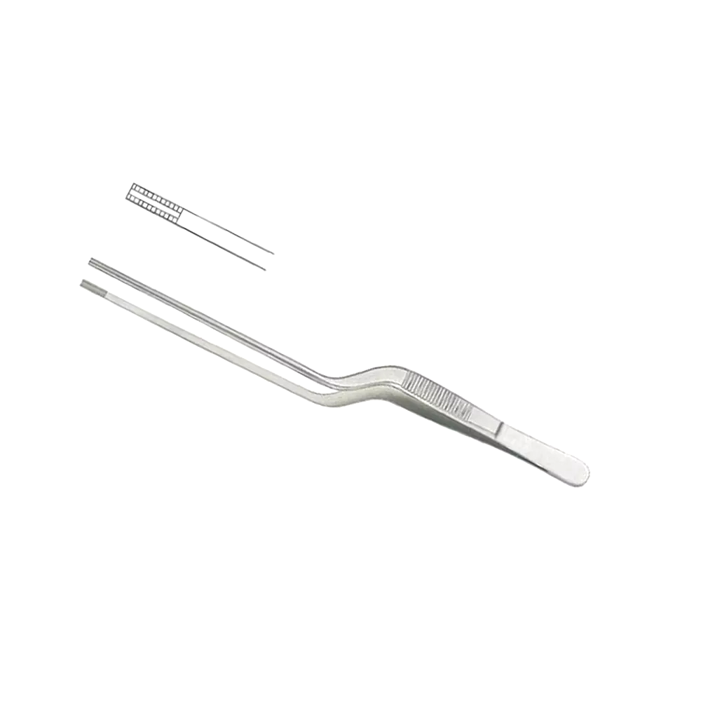 Brown Cushing Bayonet Tissue Forceps Flat Handles 180mm – General Surgery Instruments The Brown Cushing Bayonet Tissue Forceps 180mm Flat Handle are high-precision instruments developed for delicate tissue handling where visibility and control are critical. Their bayonet-shaped design keeps the surgeon’s hand out of the line of sight, providing an unobstructed view of the operative area — especially useful in ENT and neurosurgical procedures. The flat, textured handles offer superior grip and stability, ensuring fine tactile feedback during tissue manipulation. Made from premium surgical stainless steel, these forceps are corrosion-resistant, lightweight, and fully autoclavable. Their serrated tips enhance precision while preventing tissue slippage, making them indispensable for delicate surgical work.