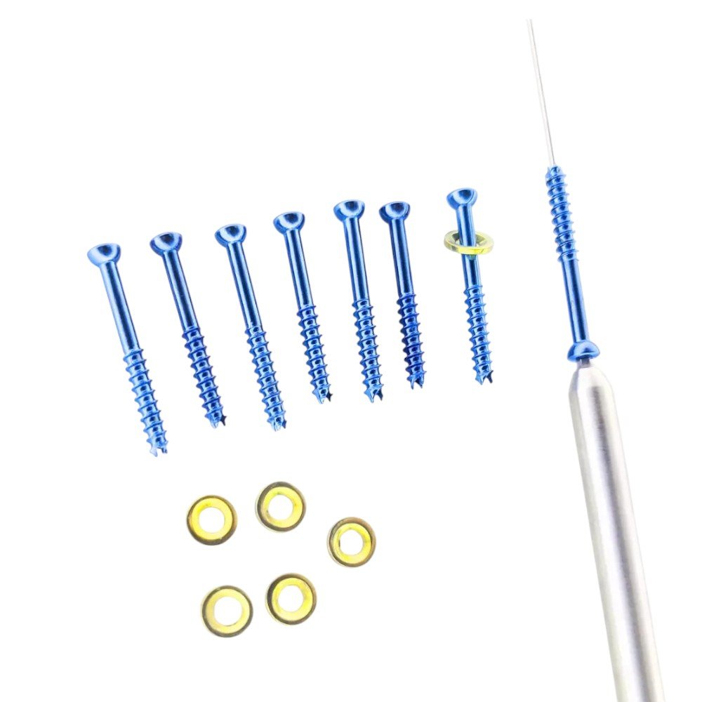 Complete 86-piece titanium set of cannulated cancellous screws with washers.