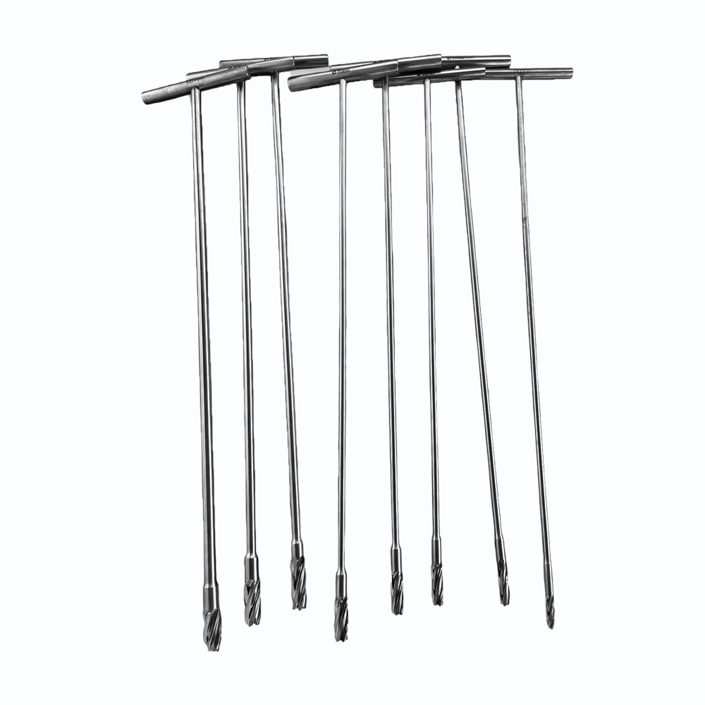 This Cannulated Hand Reamer Surgical Instruments Set – 8 pcs (Orthopedic) is engineered for precision bone preparation during various surgical procedures involving guidewire-assisted drilling. Each reamer is designed with smooth, sharp cutting flutes to ensure efficient and controlled removal of bone while maintaining alignment through its central cannulation. The ergonomic handpiece design provides improved surgeon comfort and stability, ensuring smoother manual operation during demanding procedures. Manufactured from high-quality medical stainless steel, the instruments deliver excellent durability, corrosion resistance, and performance consistency. Ideal for trauma, reconstructive, and implant surgeries, this set is essential for accurate canal shaping and preparation for screws, nails, and implants.