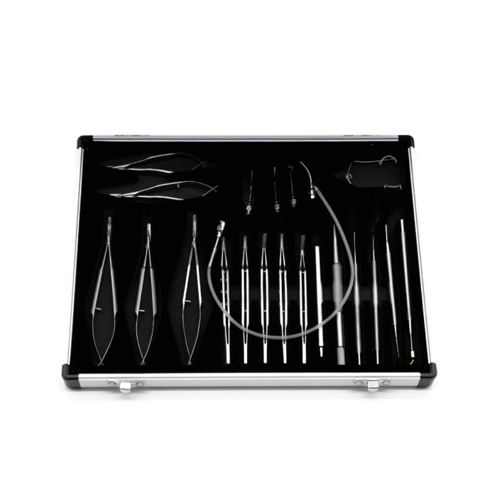 The 21-Piece Cataract & Intraocular Lens Implantation Micro Instruments Set with Box – Ophthalmic & Veterinary Surgical Tools is a complete solution for performing cataract surgeries and intraocular lens implantation procedures. Made from high-grade stainless steel, this set provides all the tools needed for ophthalmic and veterinary microsurgery.