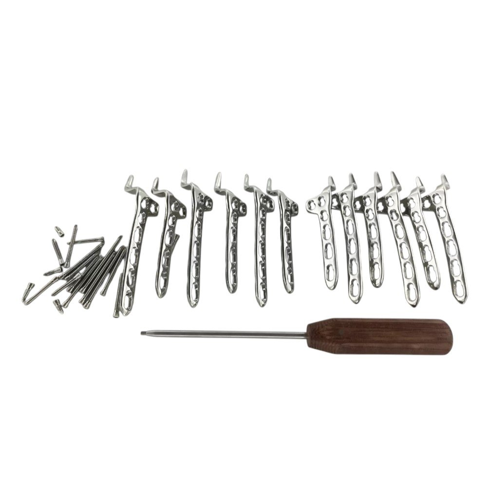 The Clavicle Hook LCP Plate 3.5mm Set by Zabeel Industries is expertly designed for the fixation of lateral clavicle fractures and acromioclavicular joint dislocations. Crafted from premium 316L stainless steel, the plate features a unique hooked design that provides superior subacromial support and stability without compromising soft tissue integrity. Available in both left and right orientations with 3–5 holes, the low-profile plate minimizes discomfort and reduces the need for hardware removal. The 38-piece set includes precision-matched 3.5mm locking and cortical screws organized in a sterilizable tray for efficiency. Combining the benefits of locking compression technology with anatomical contouring, this system ensures reliable fixation and accelerated rehabilitation.