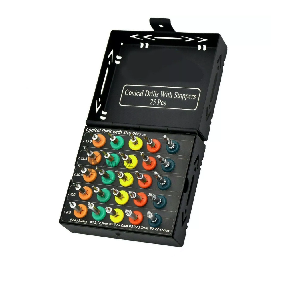 The Conical Drills Dental Implant Surgical Kit – Black, 25 Pieces with Stoppers is a professional 25-piece set designed for precise osteotomy and implant site preparation. Each drill features a conical design for controlled bone penetration and stability, while included stoppers allow for consistent depth control during implant placement.