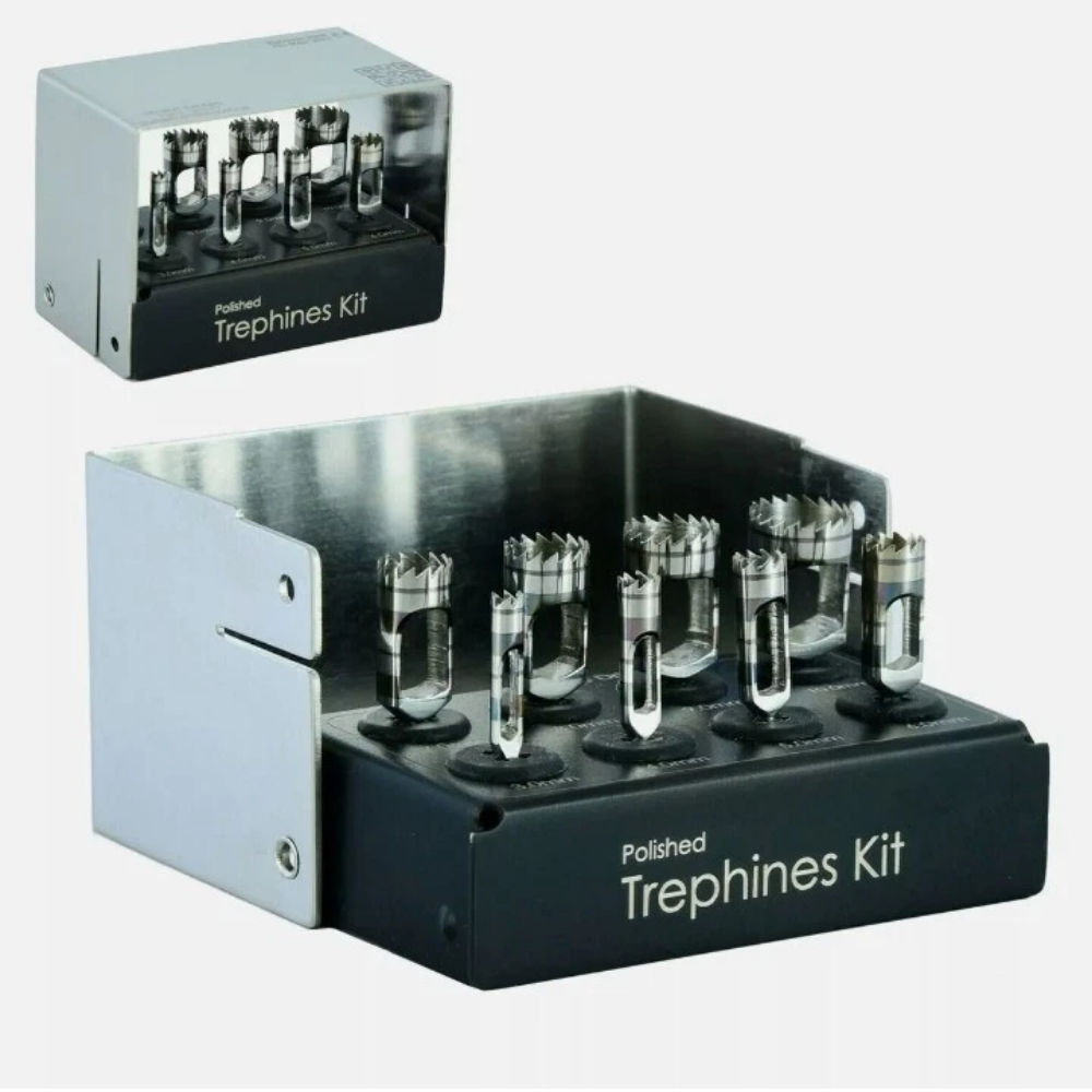 8-piece dental implant trephine kit for precise osteotomy and implant preparation.