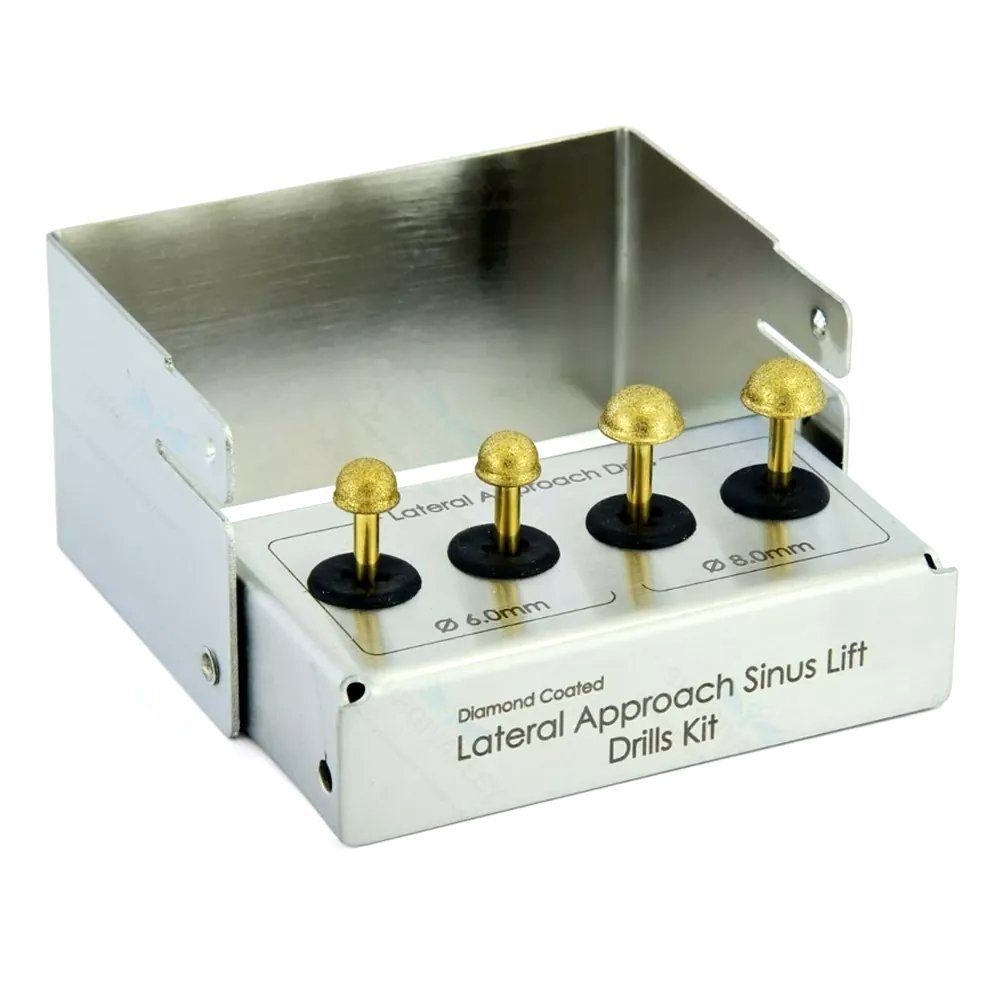 The Dental Lateral Approach Drill Kit – Sinus Lift & Membrane Diamond-Coated Burs (CE Certified) is a specialized surgical system for sinus lift procedures, enabling safe and precise lateral access to the sinus membrane. Each bur in the set is diamond-coated to ensure smooth cutting, minimal bone trauma, and reduced risk of membrane perforation.