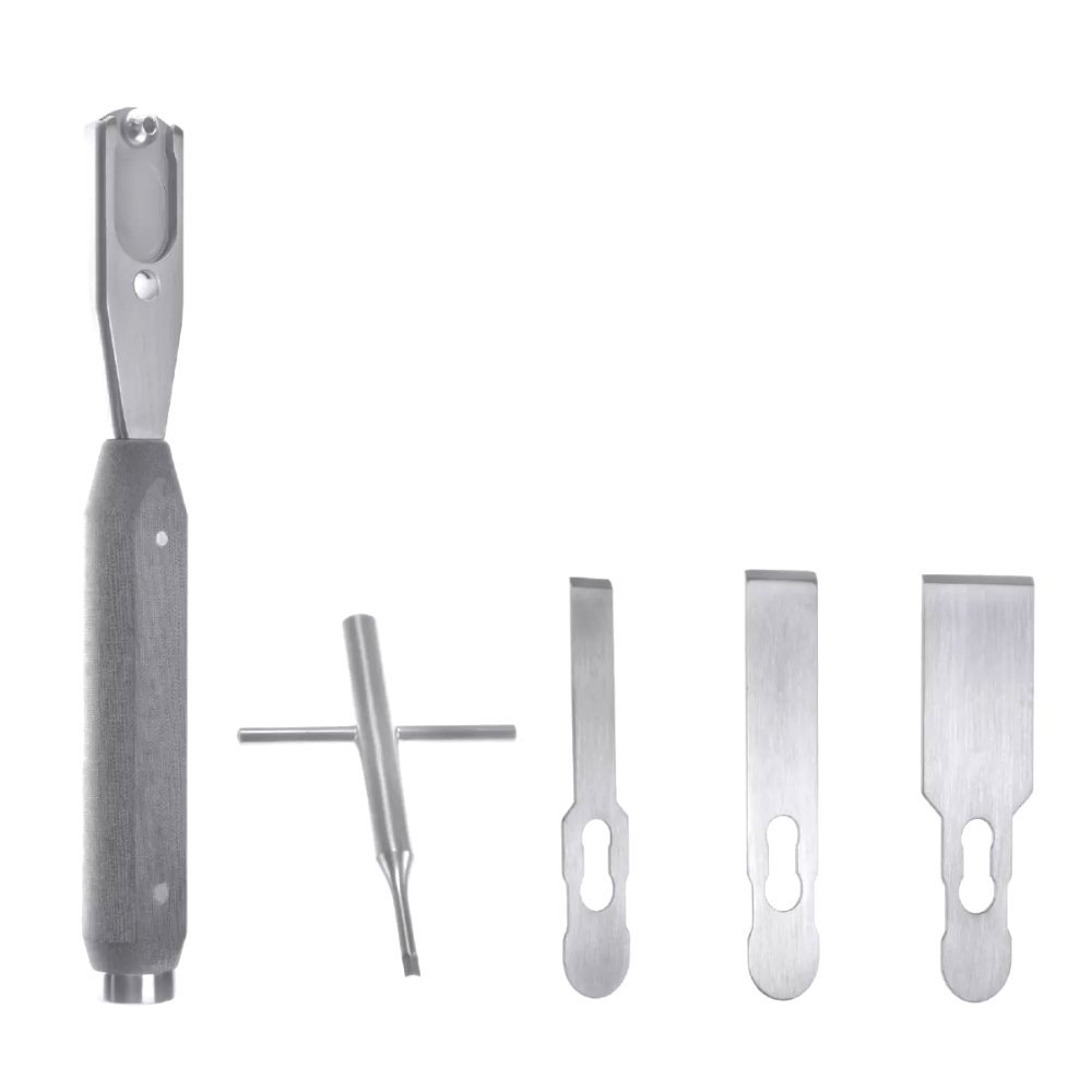 The Dermatology & Holloware Interchangeable Chisel Blade Set is a versatile, cost-effective solution for surgeons requiring multiple blade options within a single system. This comprehensive set includes a range of precision-engineered blades designed for compatibility with standard handpieces, allowing quick and secure blade exchange during procedures. Each blade is crafted from surgical-grade stainless steel to ensure sharpness, durability, and resistance to corrosion. The interchangeable system minimizes downtime, enhances surgical flexibility, and eliminates the need for multiple fixed-handle chisels. Ideal for orthopedic, neurosurgical, and reconstructive applications, this set ensures consistent performance and precision across all procedures.