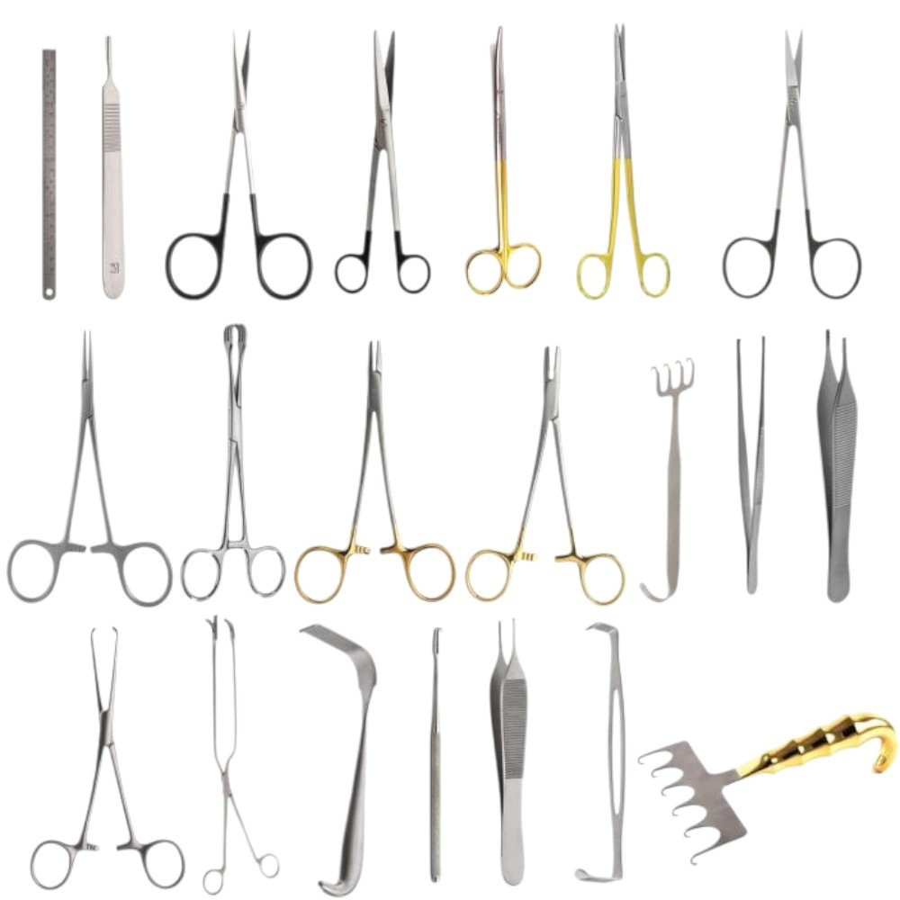 Includes scalpels, scissors, artery forceps, bone-cutting tools, and suturing instruments