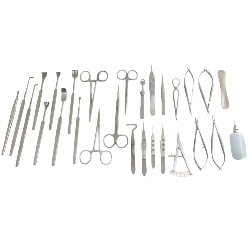 28-piece comprehensive micro-surgery kit for eyelid and ocular procedures.