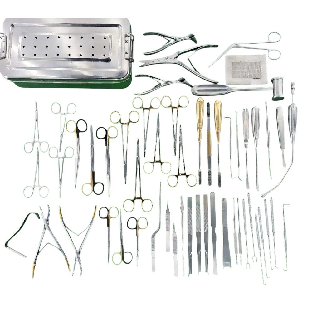 The Gunter Rhinoplasty Instruments Set – 55 Pcs (German Quality) is a precision-engineered 55-piece kit for cosmetic and reconstructive nasal surgery. Crafted to German-quality standards, the set includes elevators, scissors, forceps, retractors, and rasps to facilitate both open and closed rhinoplasty techniques. High-grade surgical stainless steel ensures durability, corrosion resistance, and long-lasting sharpness. This set is ideal for ENT surgeons and plastic surgeons who require a complete, reliable, and professional instrument collection for meticulous nasal procedures.