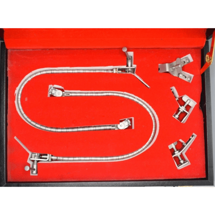 The complete set includes flexible arms, frame attachments, and retractor blades, all manufactured from high-grade stainless steel with smooth finishes to ensure durability, easy sterilization, and compatibility with repeated autoclaving. This system is widely trusted in cranial, spinal, vascular, and tumor-related neurosurgeries, making it an indispensable tool for operating rooms worldwide.