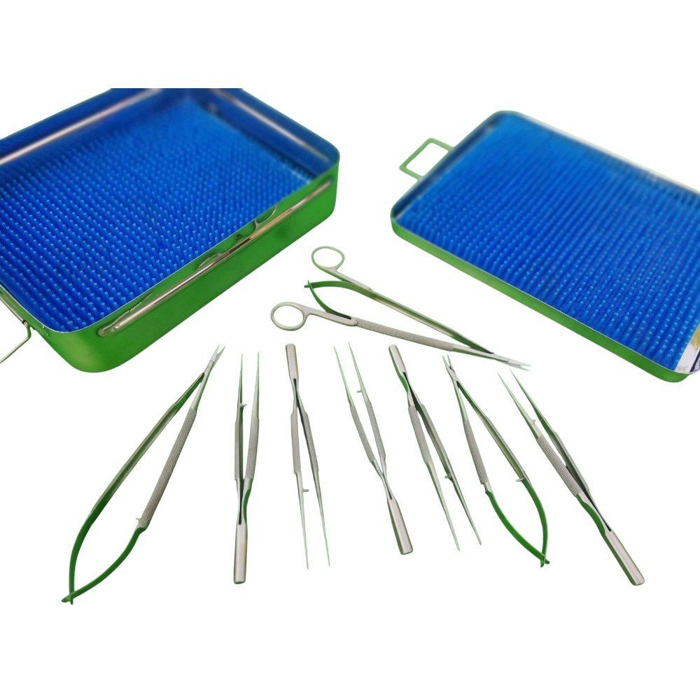 Includes fine forceps, scissors, elevators, and needle holders