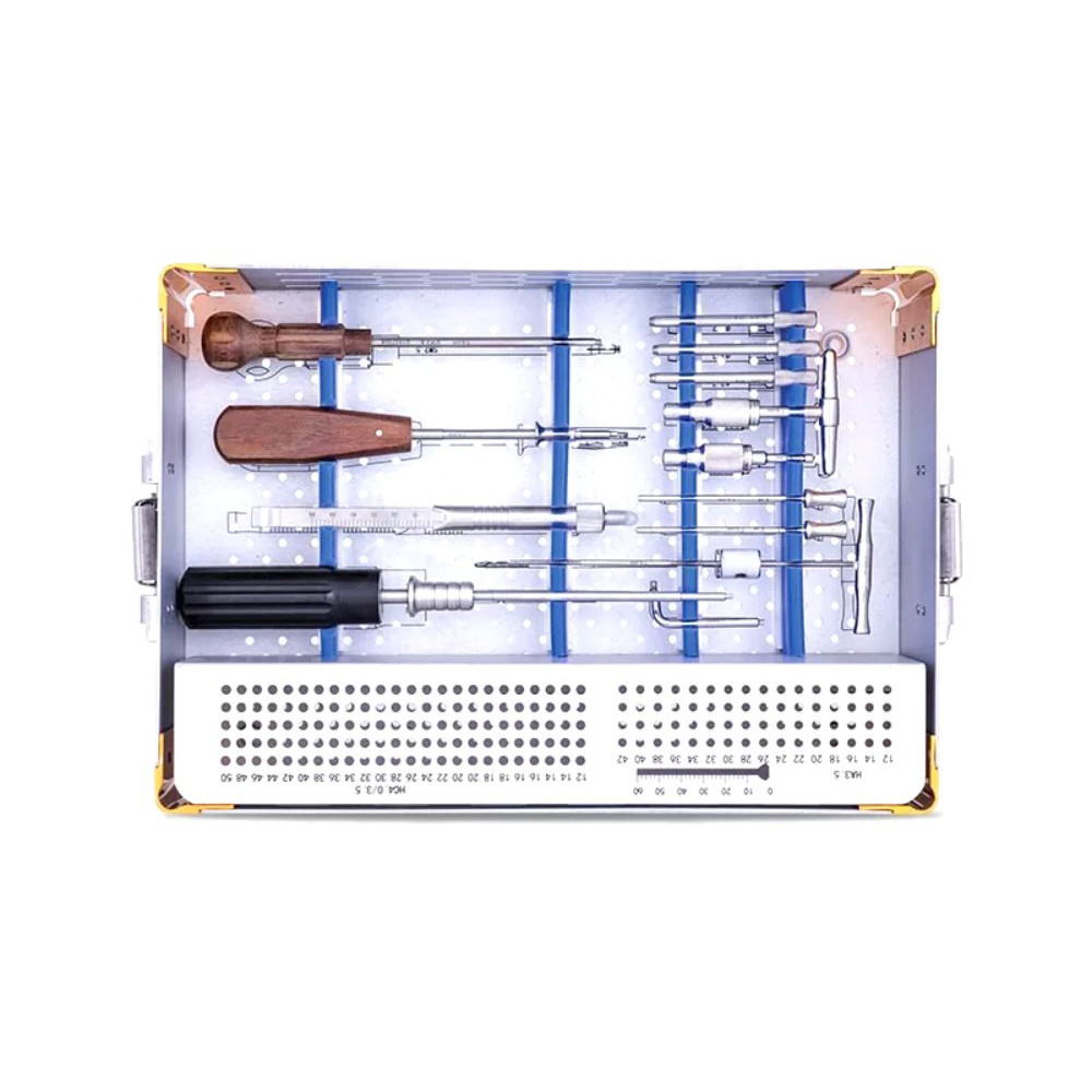 This locking set allows surgeons to achieve optimal screw alignment and plate stability during trauma repair surgeries. The ergonomic and lightweight instruments reduce fatigue while improving surgical precision. Supplied in a sterilization tray, this set supports efficient organization and sterile handling throughout the surgical process — an essential for every orthopedic department.