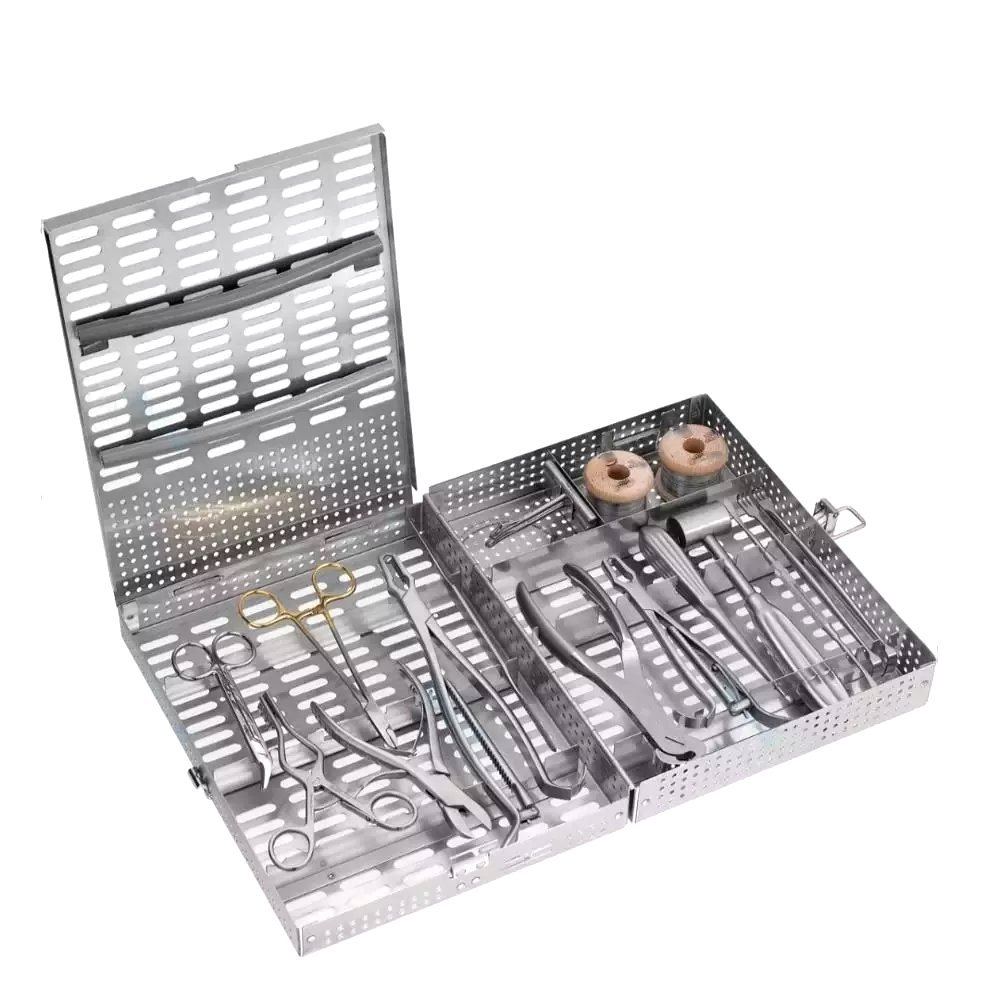 The set includes key instruments such as bone holders, reduction forceps, retractors, and elevators — all stored in a hygienic stainless-steel cleaning cassette that simplifies sterilization and storage. Compact yet comprehensive, this set is ideal for clinics, mobile veterinary units, and educational institutions that require reliable tools in an efficient, easy-to-manage configuration.
