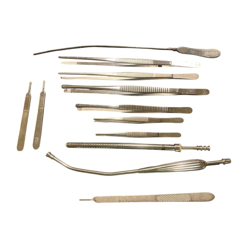 Includes clamps, retractors, scissors, forceps, tenacula, and suturing instruments.
