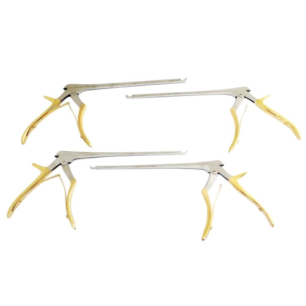 The Kerrison Rongeurs 2, 3, 4, 5mm – 4 PCs Set Gold Handle Orthopedic Instruments includes four precision rongeurs in 2 mm, 3 mm, 4 mm, and 5 mm sizes, engineered for fine bone removal in spine, orthopedic, and neurosurgical procedures. Each rongeur features a gold-plated handle for enhanced aesthetic appeal and corrosion protection. The ergonomic design provides superior control and reduces surgeon fatigue during long operations. The cutting jaws are precision-honed for smooth bone resection, while the stainless steel construction ensures consistent performance and durability.