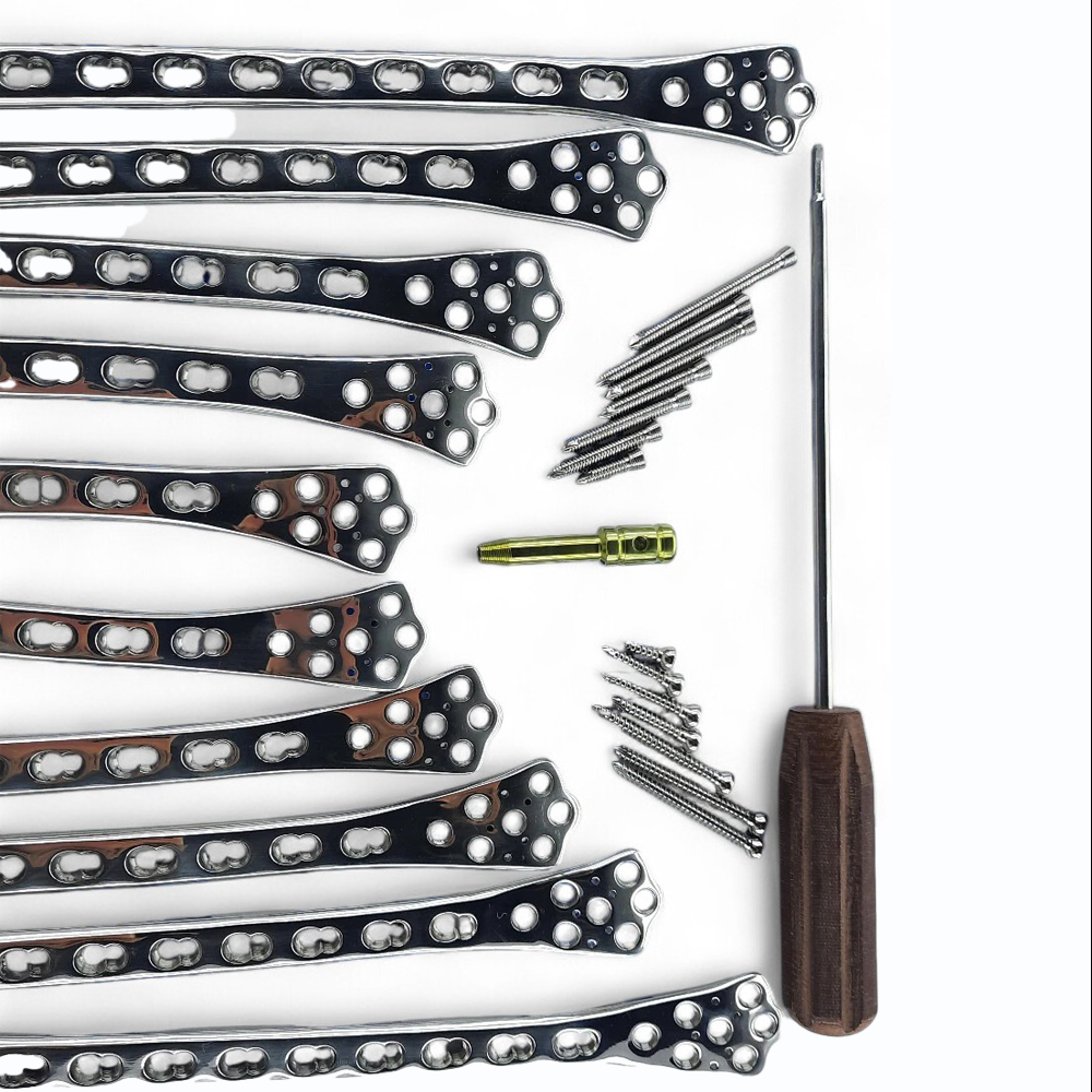 These Locking Distal Femur Plates – 4.5/5.0 mm, 5/7/9/11/13 Holes with Screws – 102 pcs, SS 316L are engineered for complex distal femoral fractures requiring high-strength fixation and anatomical contouring. Manufactured from surgical-grade SS 316L, the plates deliver exceptional rigidity, corrosion resistance, and long-term durability under large physiological loads. Designed in 5-hole, 7-hole, 9-hole, 11-hole, and 13-hole configurations, this system supports a wide range of fracture patterns—from extra-articular to intra-articular comminution. The compatibility with 4.5/5.0 mm locking screws ensures rigid angular stability, essential for maintaining reduction in osteoporotic or severely fragmented bone.