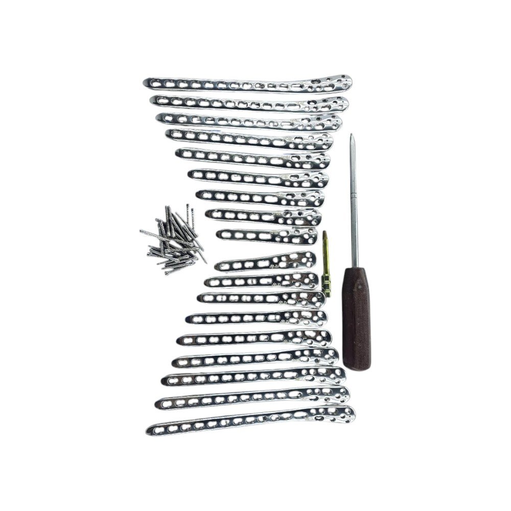 This Locking Low Bend Medial Distal Tibia Plate (4-12 Hole) L&R with LCP Screws – Stainless Steel is specifically designed for the management of distal tibial fractures. Its medial contour ensures perfect anatomical fit while reducing soft tissue irritation. The plate is made from high-quality stainless steel and includes 190 LCP (Locking Compression Plate) screws for secure, stable fixation. Left and right variants cater to all surgical needs, making it versatile for complex tibial reconstructions.