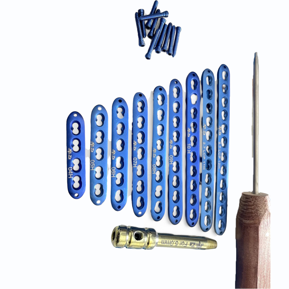 These Locking Straight Plates – 2.7 mm, 4 to 12 Holes with 2.7 mm LCP Screws – 86 pcs Titanium are designed for small bone fixation, including hand, wrist, clavicle, and forearm procedures. Crafted from high-strength Titanium Grade 5, the plates provide excellent stability with minimal weight, ensuring compatibility with delicate bone structures. Available in hole configurations from 4 to 12, the plates allow surgeons to treat simple fractures, segmental breaks, and complex multi-fragment patterns. The 2.7 mm locking screw interface ensures strong angular stability in both normal and weaker bone.