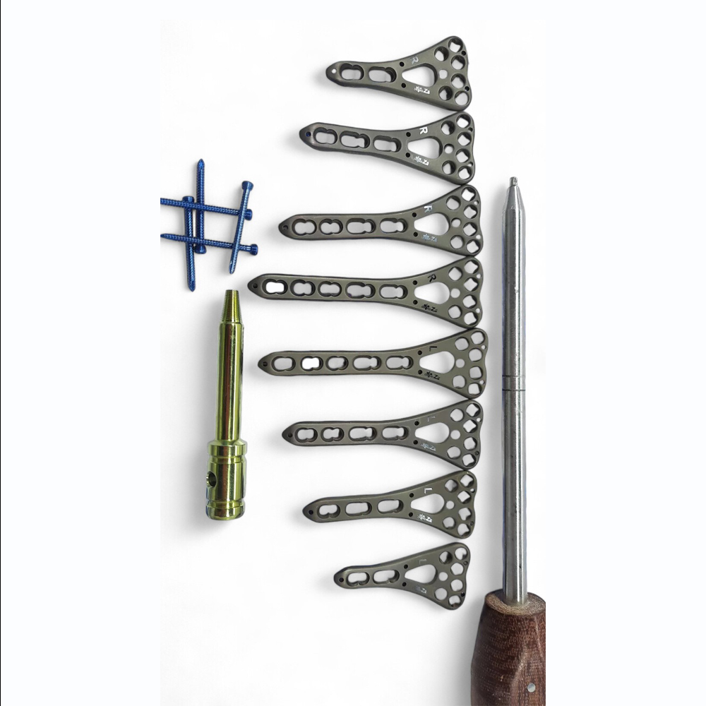 The Locking Variable Angle Distal Radius Volar Plate – 2 to 5 Holes, L & R, with Screws – 79 pcs Titanium is crafted from Titanium for superior strength and biocompatibility. Designed for volar plating techniques, the plate allows surgeons to place screws at variable angles, maximizing purchase in subchondral bone and providing tailored fixation for complex distal radius fractures. Available from 2-hole to 5-hole lengths and in both left and right versions, this system offers broad adaptability for intra-articular fractures, comminuted fractures, and osteoporotic bone.