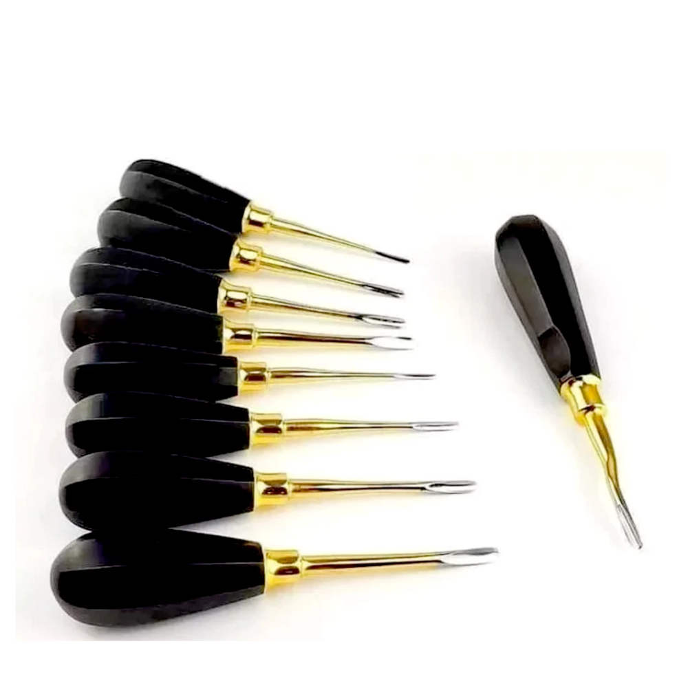 Each elevator features a striking black and gold finish that not only enhances the aesthetic appeal but also increases durability and resistance to surface wear. Both straight and curved profiles are included, enabling superior access to anterior and posterior regions of the mouth. The ergonomic handles offer enhanced grip and tactile sensitivity, helping reduce hand fatigue during longer procedures. Manufactured using high-strength stainless steel, these elevators maintain sharpness, strength, and precision through repeated sterilization cycles.
