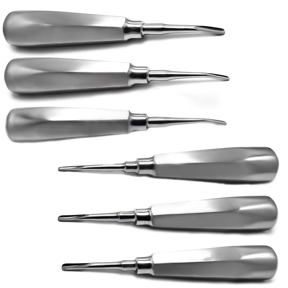 The Luxating Root Elevators Set is specifically designed for atraumatic dental extractions. Unlike conventional elevators that rely on prying force, luxators are equipped with fine, sharp, and narrow blades that gently sever periodontal ligaments and expand the alveolar socket. This ensures smooth, controlled extractions while minimizing trauma to gingival tissues and preserving alveolar bone, which is especially valuable in implant dentistry. The set includes multiple sizes and angulations to cover anterior, posterior, and root fragment extractions.