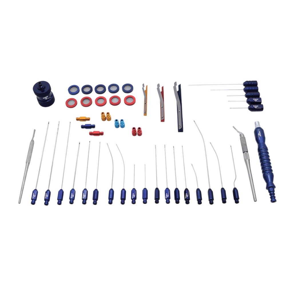The Nano Fat Harvesting Liposuction Cannula Set Complete is designed for advanced fat grafting procedures where fine detail and precision are critical. This complete kit allows surgeons to harvest, process, and re-inject fat in micro and nano-particle form, ensuring higher cell viability and smoother grafting results. It is particularly suited for facial rejuvenation, scar correction, and delicate contouring work. Each cannula is made from lightweight, polished stainless steel, with carefully engineered diameters to allow for gentle fat aspiration without damaging adipose cells. The set also includes micro-injection cannulas for controlled fat delivery, enabling seamless transplantation into even the most delicate tissues. For surgeons seeking excellence in fat transfer, this kit delivers unmatched precision and clinical success.