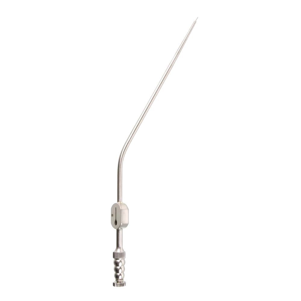 The tapered, angled stainless-steel shaft enables easy access into narrow or deep surgical corridors, while the Raindrop-style tip ensures consistent aspiration without clogging. This instrument is ideal for microdissection, cerebrovascular surgery, and minimal-access spinal decompressions where low-pressure, precision suction is vital.
