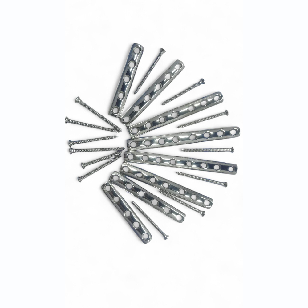 This . One-Third Tubular Plate 3.5 mm with 3.5 mm Cortical Screws – 64 Pc Set is designed for fracture stabilization in the clavicle, fibula, radius, ulna, and other long bones requiring small-fragment fixation. Manufactured with high durability and anatomical contouring, the plate offers strong mechanical support while maintaining low profile to reduce soft-tissue irritation. The included 3.5 mm cortical screws ensure secure fixation and optimal compression during healing. This 64-piece set is engineered for trauma, sports injury repair, and reconstructive procedures, providing reliable strength and long-term stability.