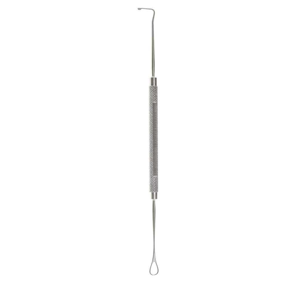 The Ophthalmology Kirby Expressor Hook and Loop is a precision ophthalmic instrument designed for the controlled expression of meibomian glands during lid procedures. Its dual-ended configuration, featuring a hook and loop tip, provides versatility for expressing gland contents or manipulating delicate tissues. Crafted from high-quality stainless steel, it ensures durability, smooth handling, and precise tactile feedback. Commonly used in oculoplastic and lid margin surgeries, this instrument combines finesse with functionality for optimal results.