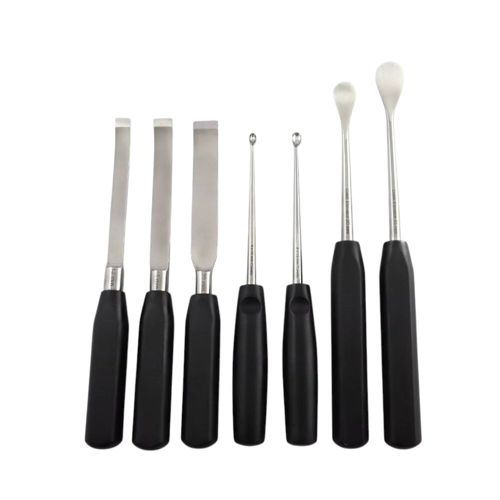 7-piece orthopedic surgical set including periosteal elevators, chisels, and bone curettes.