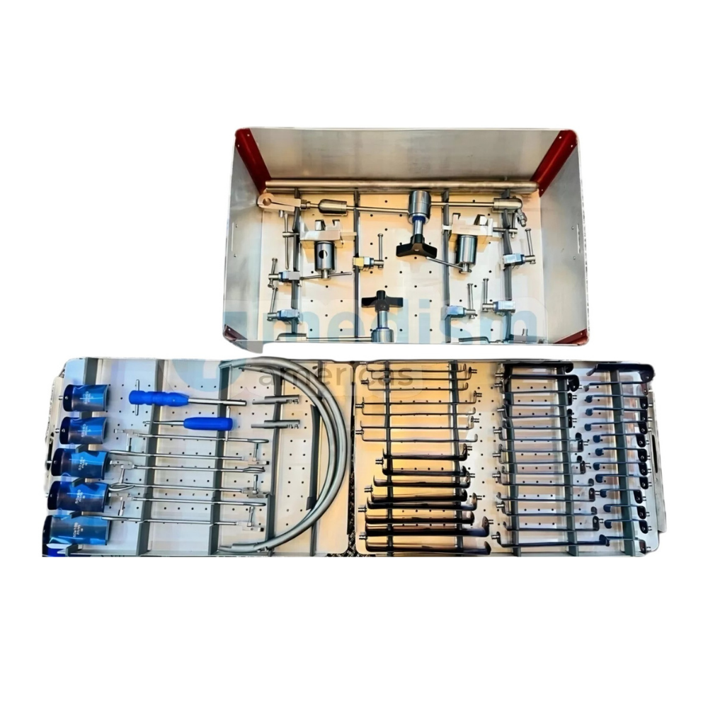 The Phantom AL Anterior Lumbar Surgical Access Instrument System & Sterilization Box is a comprehensive set designed for precise and safe anterior lumbar spine procedures. The system includes high-quality instruments with ergonomic designs, supplied in a durable sterilization box for secure storage and easy sterilization.