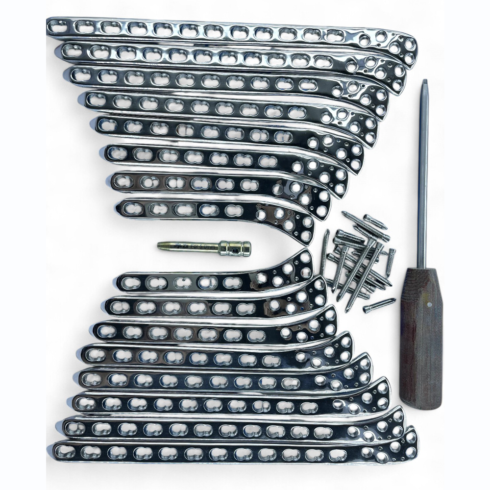 The Proximal Lateral Tibial LCP Plate (4 to 12 Hole) L&R with 5mm Screws – Stainless Steel 316L is a precision-engineered implant designed for fixation of complex proximal tibial fractures. Its lateral anatomical contour ensures an optimal fit while minimizing soft tissue irritation. Manufactured from high-grade Stainless Steel 316L, the plate provides exceptional strength, corrosion resistance, and biocompatibility. The set includes 139 screws for secure locking fixation, ensuring stability in both osteoporotic and healthy bone. Left and right-sided plates guarantee anatomical accuracy during surgery.
