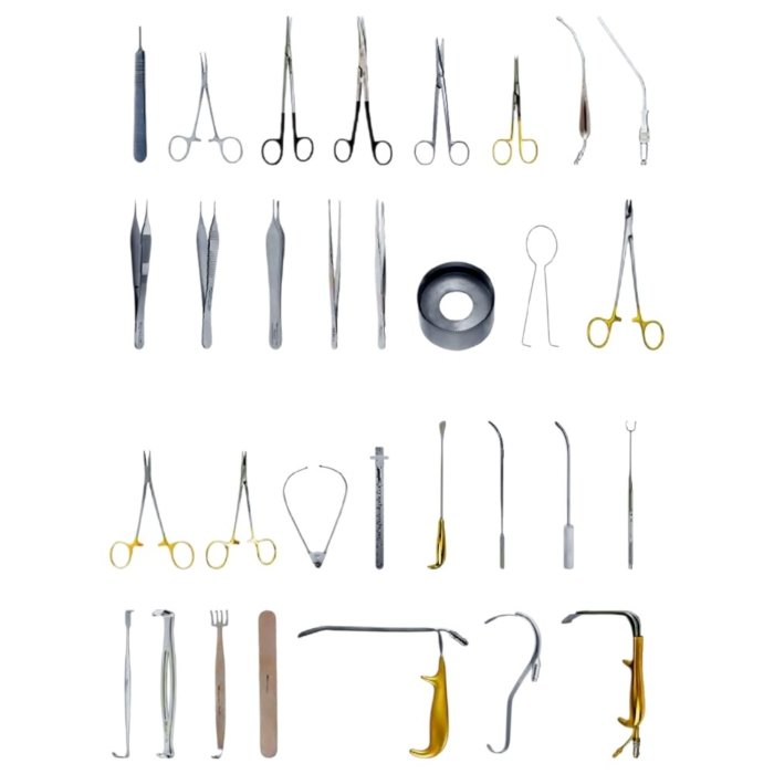 • Instrument range: Scalpels, scissors, artery forceps, dissecting forceps, retractors, and suturing instruments